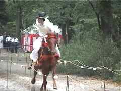葵祭りの行列は、下鴨神社で2時間滞在する。 その間、糺の森では古式に則った馬術が披露される。
