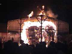 昨年のお飾りを燃やす森の中の巨大な焚き火。 火がつけられるのは夜の12時だ。 ここは全国60余りの神社をまとめて祈願できる大元宮の前である。